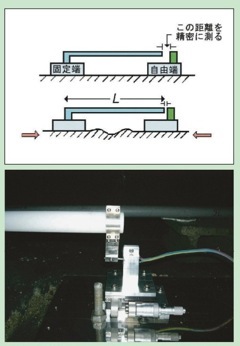 伸縮計の概念図(上)と伸縮計の変位センサー部分(下)。 白いパイプは基準尺として使用している溶融石英管。