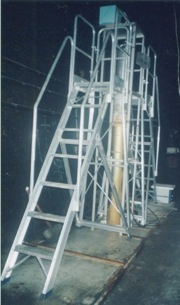 花崗岩流動室内実験のための花崗岩石柱。自重だけでの 変形を観るためのもの(上)と,中央部に荷重を掛けているもの(下)がある。