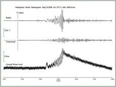 2008年四川地震に際して得られた歪地震波形と水位変化。水位変化は地震波 によって周辺の岩盤が変形したために生じたと考えられる。
